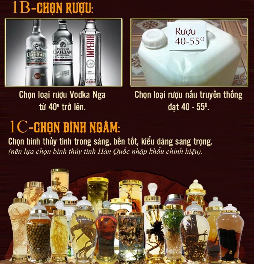 Rượu nên chọn loại rượu ngon khoảng 35 độ, tốt nhất là rượu gạo nếp truyền thống. Nên tránh sử dụng rượu thấp cấp hoặc chứa hóa chất. Bình để ngâm rượu là bình thủy tinh cao cấp, không chứa độc tố, chống được va đập và trong suốt để phóng to vật thể ngâm một cách đẹp nhất.