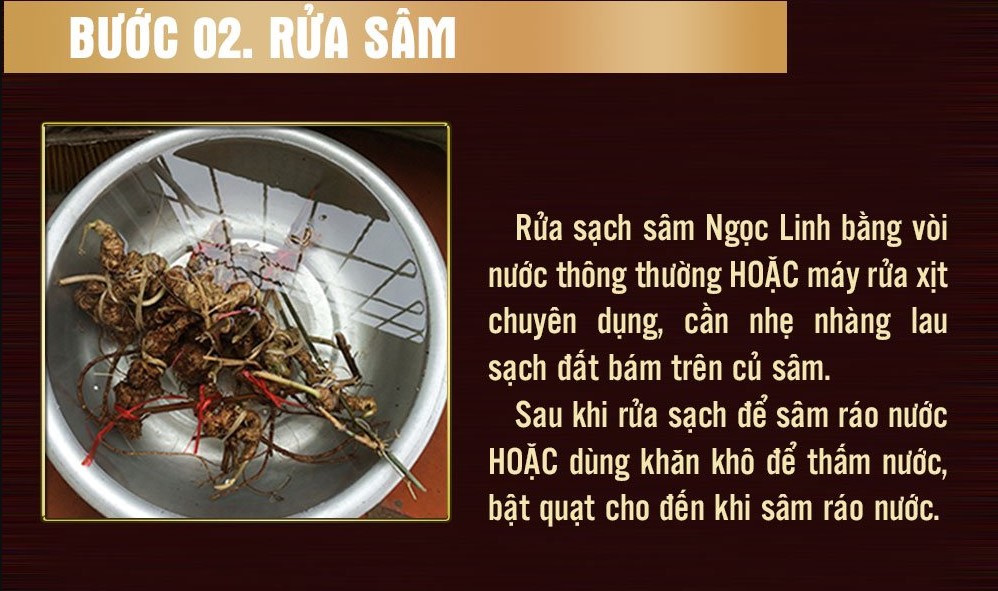 + Rửa sạch sâm Ngọc Linh bằng nước lạnh để loại bỏ bụi bẩn và cặn bẩn.